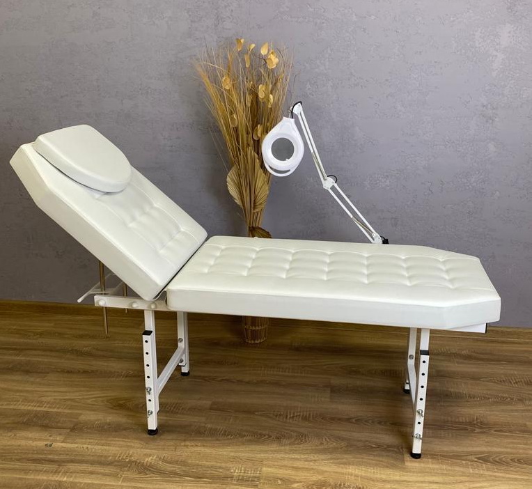 По краям ложа предусмотрены специальные отверстия для установки лампы-лупы, что способствует повышению качества процедур. Кушетка разборная, что облегчает транспортировку и снижает связанные с этим расходы. Покрытие кушетки может быть выбрано по желанию заказчика.