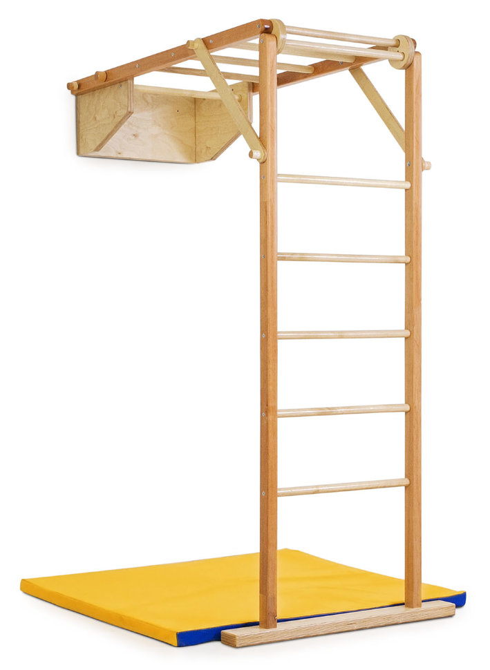 Конструкция комплекса напоминает стандартную деревянную шведскую стенку, однако уникальные инженерные решения значительно расширяют функциональные возможности изделия. Рукоход и лестница фиксируются к стене посредством компактного турника и специальных крепежных элементов. Лестницы соединены креплением, обеспечивающим как надежную фиксацию комплекса, так и возможность его быстрого складывания для хранения.