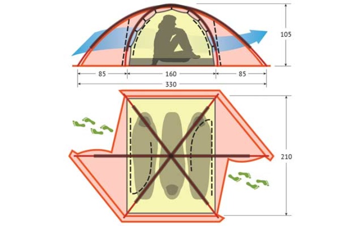 Универсальная палатка, предназначенная для восхождений и базовых лагерей. Конструкция с внешними дугами обеспечивает быструю установку. Многоточечная система оттяжек, усиленная стрепами юбка и каркас из трех дуг способствуют высокой устойчивости палатки даже при сильном шторме.