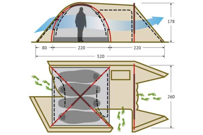 - Входы во внутреннюю палатку закрываются тканевым пологом и москитной сеткой. Молнии различаются по цвету для удобства использования.