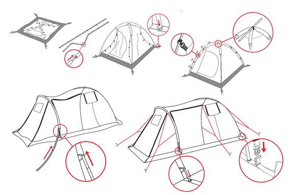 - Удобство эксплуатации обеспечивается цветовой маркировкой элементов для быстрой сборки, крупными молниями с разгрузочными крючками, вместительными внутренними карманами и компрессионным транспортным мешком.