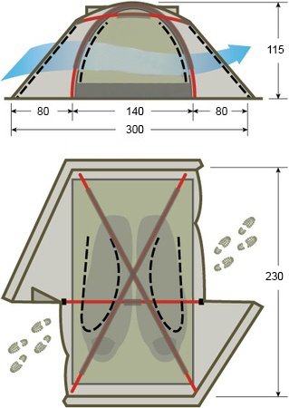 - Двухслойная конструкция обеспечивает циркуляцию воздуха между внешним тентом и внутренней палаткой, предотвращая образование конденсата и обеспечивая термозащиту.
