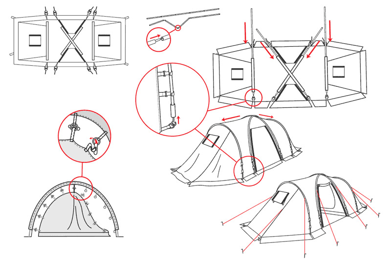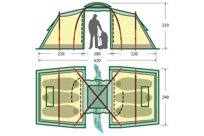 - Внешние дуги позволяют устанавливать палатку даже в дождь, не намочив спальню.