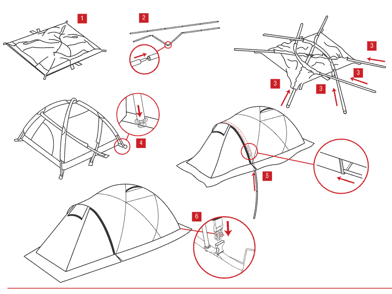 - Четыре дуги с семью точками пересечения для внутренней палатки и одну дугу для формирования тамбура, что обеспечивает высокую ветроустойчивость.