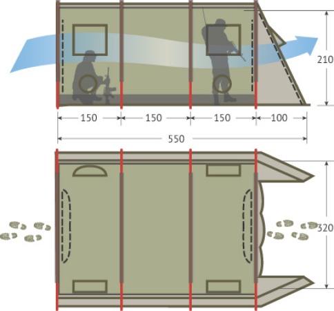 Модель Tengu Mark 62T надежно закрепляется благодаря многоточечной системе оттяжек. Внешний камуфляжный тент выполнен из прочной ткани, устойчивой к неблагоприятным погодным условиям, и обработан огнеупорной пропиткой.