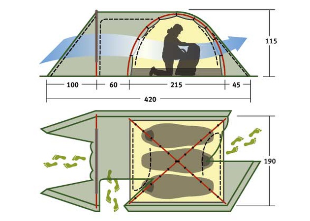 - Ветрозащитная юбка по периметру палатки защищает от холода, осадков и насекомых.