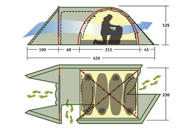 - Два вместительных тамбура позволяют хранить вещи и обувь, защищая их от осадков.