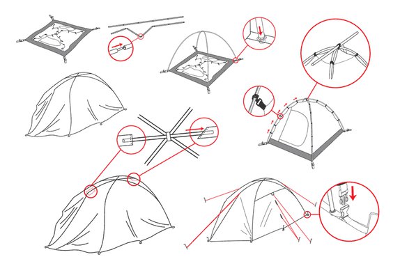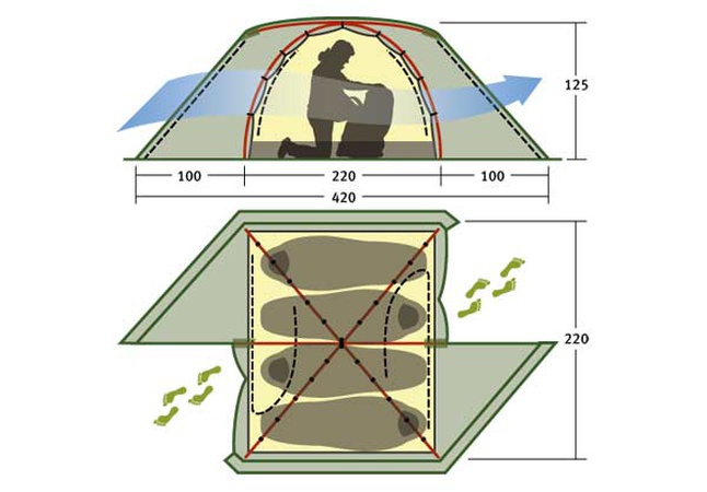 Сборка палатки занимает 8-10 минут. При правильном растяжении всех оттяжек конструкция становится очень устойчивой. Двухслойная конструкция обеспечивает эффективную вентиляцию: поток воздуха циркулирует между внешним тентом и внутренней палаткой, испаряя конденсат и выводя продукты дыхания через вентиляционную систему в верхней части купола. Воздушная прослойка также служит термобарьером, защищая от резких перепадов температур. Два входа, расположенные друг напротив друга, позволяют организовать сквозную вентиляцию в жаркую погоду.