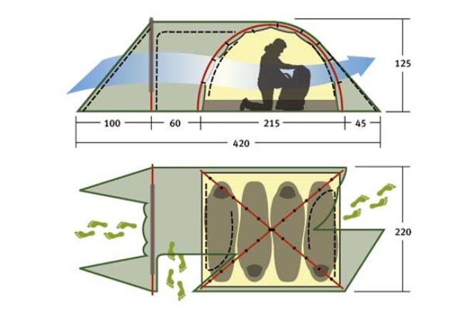 Палатка рассчитана на семейный отдых и вмещает до 4 человек. Внутреннее пространство организовано для комфортного размещения, расширенный тамбур и три входа обеспечивают удобство для нескольких пользователей, включая детей. Вентиляция реализована через два окна с ветровыми клапанами, расположенными в верхней части купола. Внутренняя палатка оснащена противомоскитной сеткой, шестью карманами, кольцом для фонаря и полочкой для мелких предметов.