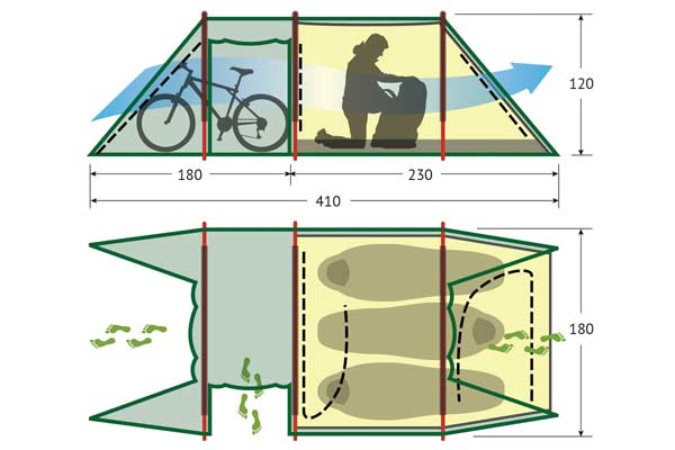 - Большой вместительный тамбур для размещения велосипедов, походной кухни и вещей.