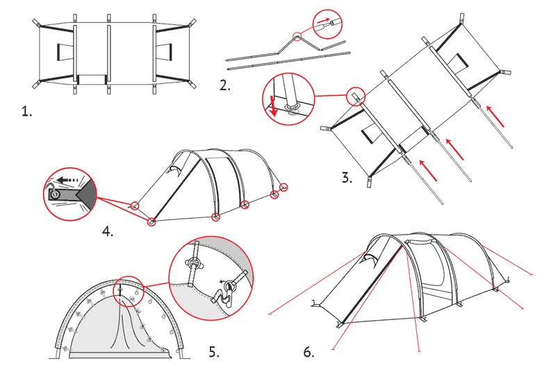 Монтаж палатки осуществляется просто: сначала устанавливается внешний тент, затем внутренняя спальня подвешивается под него. Такая последовательность позволяет сохранить спальню и вещи сухими даже при установке под дождем. Точки крепления спальни промаркированы цветом для облегчения сборки. Двухточечные оттяжки и специальные стропы с фастексом обеспечивают равномерное натяжение тента и высокую ветроустойчивость. Молнии тента защищены по всей длине специальными клапанами, которые фиксируются липучкой и вшиты отдельным проклеенным швом. При отсутствии установленной спальни внутреннее пространство палатки может использоваться как складское помещение или кают-компания.