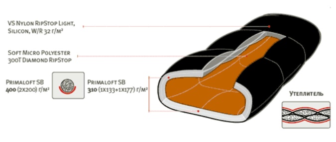 - Внешняя ткань (верх): vs 15 Nylon RipStop Light, Silicon W/R 32 г/м²
