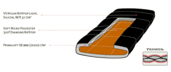 - Внешняя ткань (верх): vs 15 Nylon RipStop Light, Silicon W/R 32 г/м²
