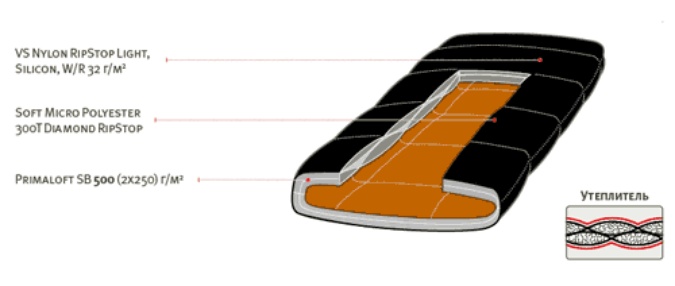 - Внешняя ткань (верх): vs 15 Nylon RipStop Light, Silicon W/R 32 г/м²