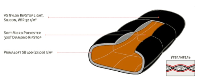 - Внешняя ткань (верх): vs 15 Nylon RipStop Light, Silicon W/R 32 г/м²