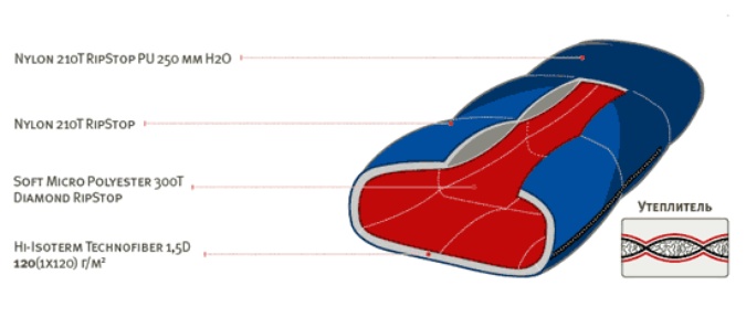 В качестве утеплителя используется Hi-Isoterm Technofiber 1.5 D толщиной 120 г/м2. Материал гипоаллергенен, сохраняет форму и обеспечивает терморегуляцию. Утеплитель сформирован в пакеты с оболочкой из легкого паропроницаемого материала.