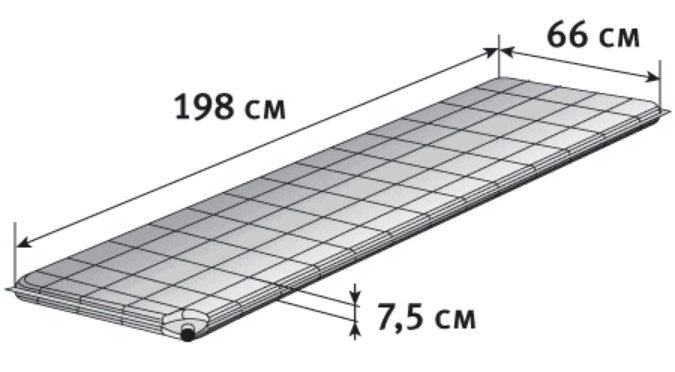 Коврик эффективно распределяет вес пользователя, обеспечивая комфортный сон, сравнимый с домашней кроватью. Толщина изделия составляет 7,5 см, что гарантирует высокую теплоизоляцию. Ширина 66 см и длина 198 см делают коврик удобным для людей крупного телосложения.
