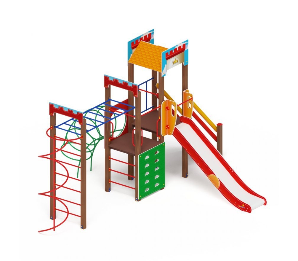 - Башня: большая башня выполнена из четырёх клеёных брусьев, окрашенных в коричневый цвет, не более 100х100 мм высота 3000 мм; пол из ламинированной фанеры, с антискользящим покрытием 1000х1000 мм толщиной 18 мм. Над башней имеется двухскатная крыша из фанеры толщиной 9 мм, малая примыкает к большой башне и украшена декоративными арками из фанеры толщиной 18 мм, кромки фанеры тщательно шлифованы, фанера окрашена в желтый и красный цвет. Размер башен 1000х1000х3500(h) мм. Отметка пола малой башни от планировочной отм. площадки 1200 мм. Отметка пола большой башни от планировочной отм. площадки 1500 мм.
