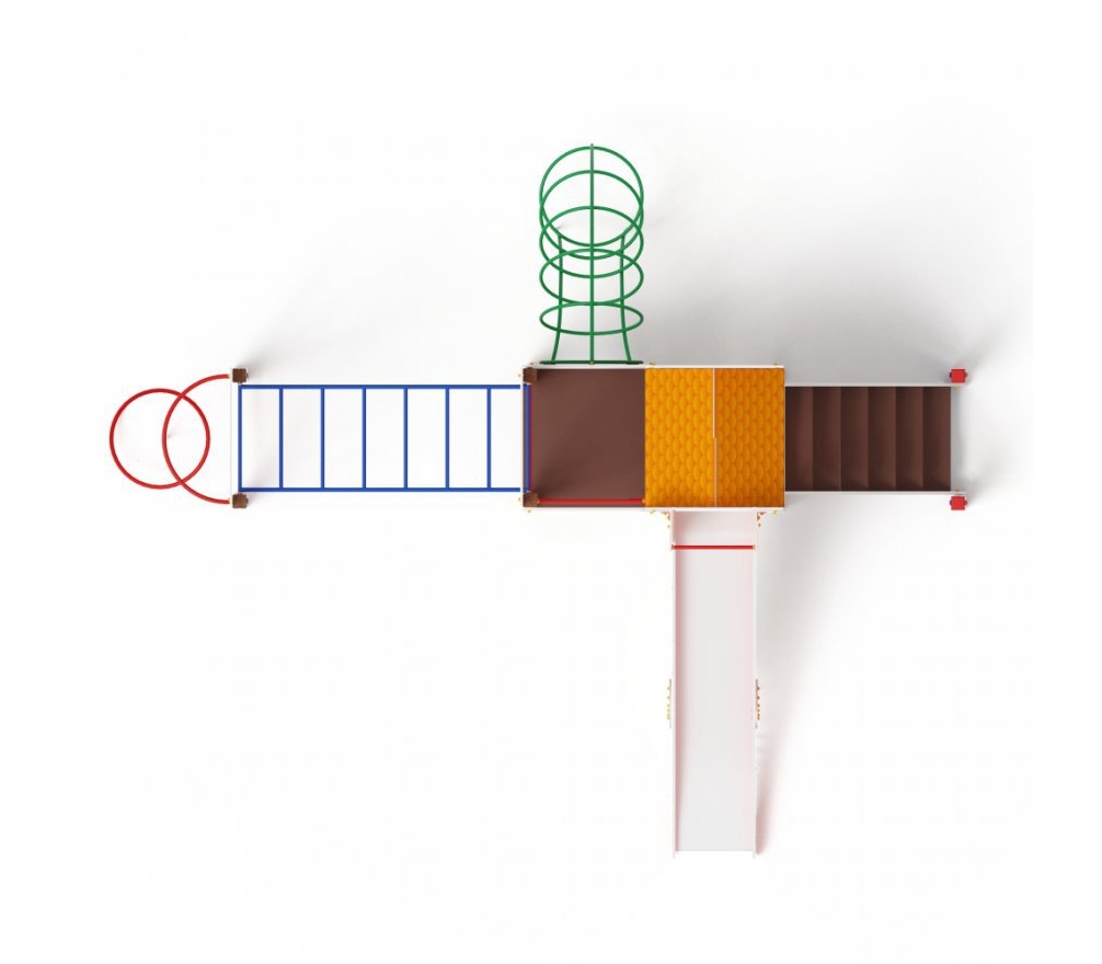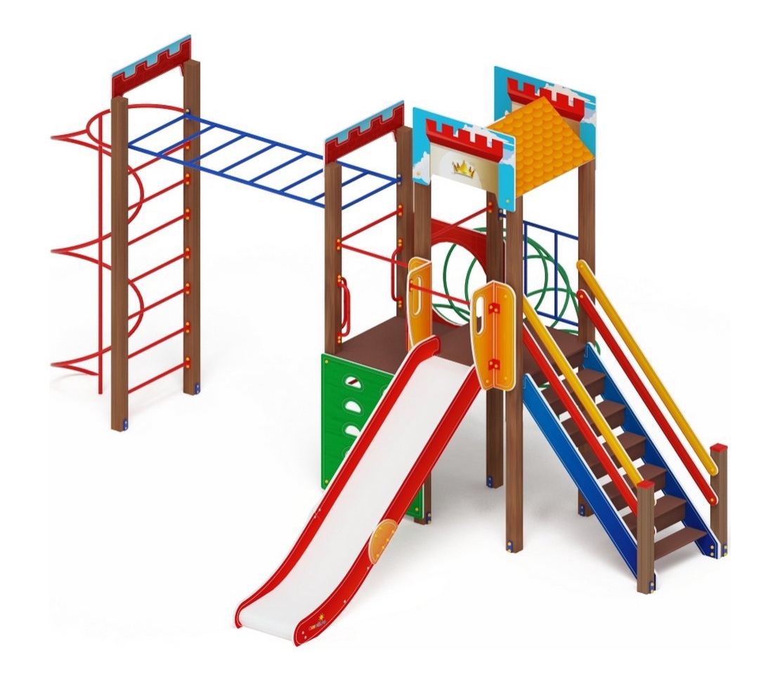 В комплекте: одна металлическая горка с высоты 150 см, скалолаз, труба наклонная из металлических колец, рукоход, вертикальный шест со спиралью.